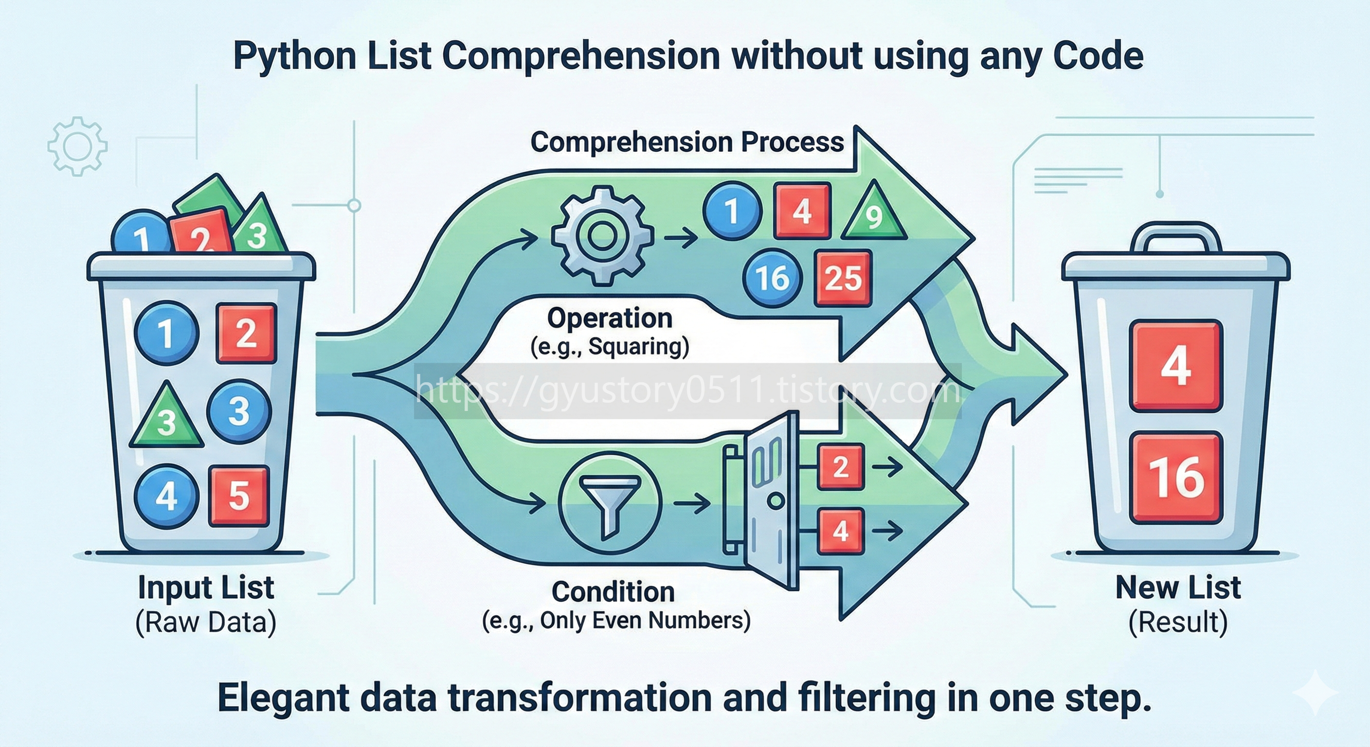 이는 집합을 정의할 때 원소를 일일이 나열하는 대신, 특정 조건을 만족하는 성질을 통해 정의하는 방식과 유사하다. 파이썬에서는 이를 프로그래밍에 접목하여, 반복 가능한 객체(Iterable)로부터 새로운 리스트를 생성하는 선언적인 문법 구조로 완성시켰다.