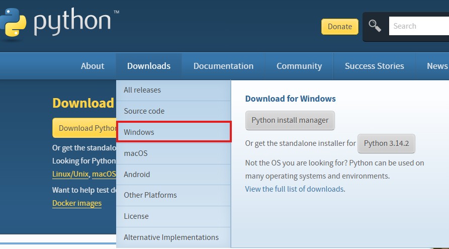 Downloads > Windows(본인에 맞는 OS) > 버전 하단이동 > Windows > Download Python install manager - 설치 확인: 윈도우 터미널이나 PowerShell을 열고 'python --version'을 입력하여 설치된 버전을 확인한다.