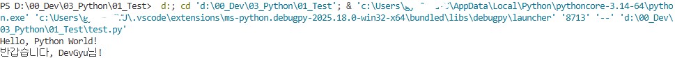 print(f"반갑습니다, {user_name}님!")테스트 시, Ctrl + F5 를 누르면 실행된다.